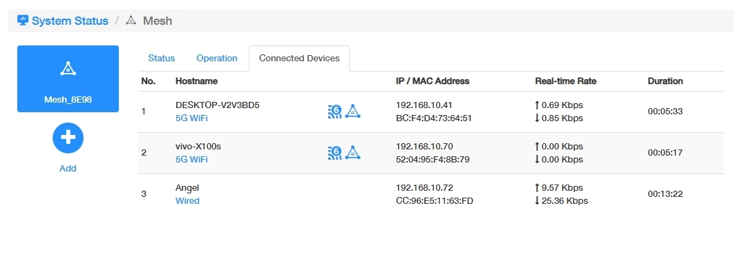 Connected Devices section displays information about the devices connected to the mesh unit, including hostname and its connection method, IP and MAC address, realtime rate and the connection duration.